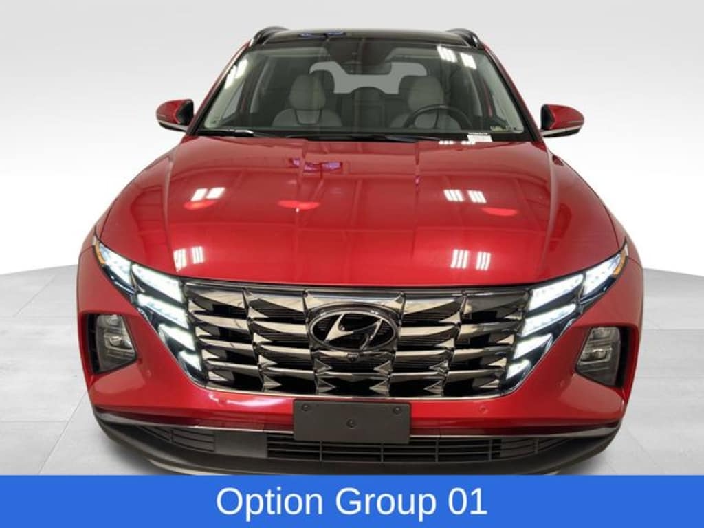 Tucson Limited, 4D Sport Utility, 2.5L I4 DGI DOHC 16V LEV3-ULEV70 187hp, 8-Speed Automatic with SHIFTRONIC, AWD, Calypso Red, Gray Leather, Navigation System, Option Group 01, Power Liftgate, Power moonroof, 3.648 Axle Ratio, 4-Wheel Disc Brakes, 8 Speakers, ABS brakes, Air Conditioning, Alloy wheels, AM/FM radio: SiriusXM, Apple CarPlay & Android Auto, Auto High-beam Headlights, Auto-dimming Rear-View mirror, Automatic temperature control, Brake assist, Bumpers: body-color, Cargo Net, Cargo Tray, Carpeted Floor Mats, Delay-off headlights, Driver door bin, Driver vanity mirror, Dual front impact airbags, Dual front side impact airbags, Electronic Stability Control, Emergency communication system: Blue Link Connected Car Service (3-year complimentary subscription), First Aid Kit, Four wheel independent suspension, Front and Rear Mudguards, Front anti-roll bar, Front Bucket Seats, Front Center Armrest, Front dual zone A/C, Front reading lights, Fully automatic headlights, Garage door transmitter: HomeLink, Heated & Ventilated Front Bucket Seats, Heated door mirrors, Heated front seats, Heated rear seats, Heated steering wheel, Illuminated entry, Leather Seat Trim, Low tire pressure warning, Memory seat, Occupant sensing airbag, Outside temperature display, Overhead airbag, Overhead console, Panic alarm, Passenger door bin, Passenger vanity mirror, Power door mirrors, Power driver seat, Power passenger seat, Power steering, Power windows, Radio data system, Radio: Bose Premium w/AM/FM/HD/SiriusXM Audio System, Rain sensing wipers, Rear anti-roll bar, Rear reading lights, Rear seat center armrest, Rear window defroster, Rear window wiper, Remote keyless entry, Roof rack: rails only, Security system, Speed control, Split folding rear seat, Spoiler, Steering wheel mounted audio controls, Tachometer, Telescoping steering wheel, Tilt steering wheel, Traction control, Trip computer, Turn signal indicator mirrors, Variably intermittent wipers, Ventilated front seats, Wheels: 19" x 7.5J" Machine-Face Finish Alloy, Tucson Limited, 4D Sport Utility, 2.5L I4 DGI DOHC 16V LEV3-ULEV70 187hp, 8-Speed Automatic with SHIFTRONIC, AWD, Calypso Red, Gray Leather, Navigation System, Option Group 01, Power Liftgate, Power moonroof. Calypso Red 2023 Hyundai Tucson Limited AWD 8-Speed Automatic with SHIFTRONIC 2.5L I4 DGI DOHC 16V LEV3-ULEV70 187hp