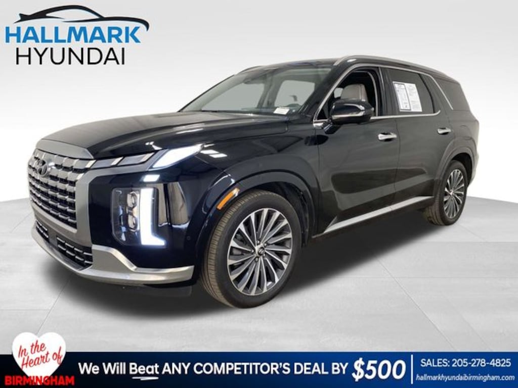 Palisade Calligraphy, 4D Sport Utility, V6, 8-Speed Automatic with SHIFTRONIC, Abyss Black Pearl, Navy/Beige Leather, Navigation System, Option Group 01, Power Liftgate, Power moonroof, 12 Speakers, 3.510 Axle Ratio, 3rd row seats: split-bench, 4-Wheel Disc Brakes, ABS brakes, Air Conditioning, Alloy wheels, AM/FM radio: SiriusXM, Apple CarPlay & Android Auto, Auto High-beam Headlights, Auto-dimming door mirrors, Auto-dimming Rear-View mirror, Auto-leveling suspension, Automatic temperature control, Brake assist, Bumpers: body-color, Cargo Net, Cargo Tray, Carpeted Floor Mats, Compass, Delay-off headlights, Driver door bin, Driver vanity mirror, Dual front impact airbags, Dual front side impact airbags, Electronic Stability Control, Emergency communication system, Exterior Parking Camera Rear, First Aid Kit, Four wheel independent suspension, Front anti-roll bar, Front Bucket Seats, Front Center Armrest, Front dual zone A/C, Front reading lights, Fully automatic headlights, Garage door transmitter: HomeLink, harman/kardon® Speakers, Heads-Up Display, Heated & Ventilated Front Bucket Seats, Heated door mirrors, Heated front seats, Heated rear seats, Heated steering wheel, Illuminated entry, Knee airbag, Low tire pressure warning, Memory seat, Occupant sensing airbag, Outside temperature display, Overhead airbag, Overhead console, Panic alarm, Passenger door bin, Passenger vanity mirror, Power door mirrors, Power driver seat, Power passenger seat, Power steering, Power windows, Premium Nappa Leather Seat Trim, Radio data system, Radio: AM/FM/MP3 Premium Audio System, Rain sensing wipers, Rear air conditioning, Rear anti-roll bar, Rear audio controls, Rear reading lights, Rear side impact airbag, Rear window defroster, Rear window wiper, Reclining 3rd row seat, Remote keyless entry, Roadside Assistance Kit, Roof Rack Cross Rails, Security system, Speed control, Speed-sensing steering, Split folding rear seat, Spoiler, Steering wheel mounted audio controls, Tachometer, Telescoping steering wheel, Tilt steering wheel, Traction control, Trip computer, Turn signal indicator mirrors, Variably intermittent wipers, Ventilated front seats, Ventilated rear seats, Wheel Locks, Wheels: 20" x 7.5J Calligraphy Exclusive Alloy, Palisade Calligraphy, 4D Sport Utility, V6, 8-Speed Automatic with SHIFTRONIC, Abyss Black Pearl, Navy/Beige Leather, Navigation System, Option Group 01, Power Liftgate, Power moonroof. Abyss Black Pearl 2024 Hyundai Palisade Calligraphy FWD 8-Speed Automatic with SHIFTRONIC V6