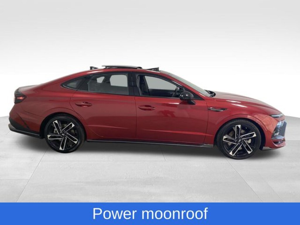 Sonata N Line, 4D Sedan, I4, 8-Speed, FWD, Ultimate red, Black, Navigation System, Power moonroof, 12 Speakers, 4-Wheel Disc Brakes, ABS brakes, Air Conditioning, Alloy wheels, AM/FM radio: SiriusXM, Apple CarPlay & Android Auto, Auto High-beam Headlights, Auto-dimming Rear-View mirror, Automatic temperature control, Brake assist, Delay-off headlights, Driver door bin, Driver vanity mirror, Dual front impact airbags, Dual front side impact airbags, Electronic Stability Control, Exterior Parking Camera Rear, Four wheel independent suspension, Front anti-roll bar, Front Bucket Seats, Front dual zone A/C, Front reading lights, Fully automatic headlights, Heated door mirrors, Heated front seats, Illuminated entry, Knee airbag, Leather steering wheel, Low tire pressure warning, Occupant sensing airbag, Outside temperature display, Overhead airbag, Overhead console, Panic alarm, Passenger door bin, Passenger vanity mirror, Power door mirrors, Power driver seat, Power steering, Power windows, Radio data system, Rear anti-roll bar, Rear side impact airbag, Rear window defroster, Remote keyless entry, Security system, Speed control, Speed-sensing steering, Speed-Sensitive Wipers, Split folding rear seat, Spoiler, Steering wheel mounted audio controls, Tachometer, Telescoping steering wheel, Tilt steering wheel, Traction control, Trip computer, Variably intermittent wipers, Wheels: N Line 19" x 8.0J Aluminum Alloy, Sonata N Line, 4D Sedan, I4, 8-Speed, FWD, Ultimate red, Black, Navigation System, Power moonroof. Ultimate red 2024 Hyundai Sonata N Line FWD 8-Speed I4